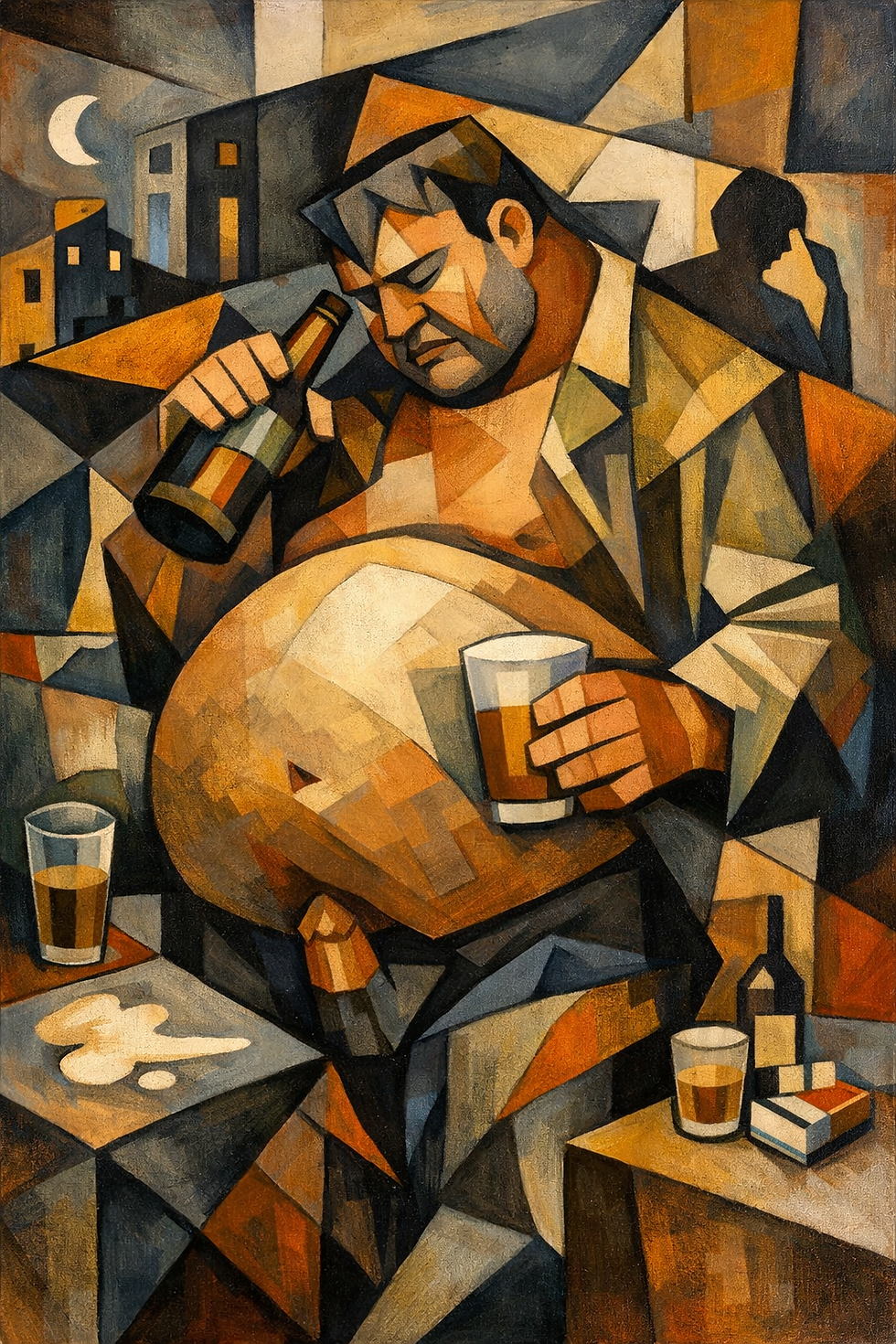Com o passar dos anos, os excessos deixam marcas no corpo. O sujeito, agora envolto por pensamentos distorcidos sobre si mesmo e sobre os acontecimentos do passado, passa a apresentar respostas corporais visíveis a esse modo de vida. A chamada “barriga de cerveja” torna-se, nesse contexto, mais do que um efeito metabólico: converte-se em um verdadeiro obstáculo ao falo. O aumento do abdômen pode dificultar a visualização e o manuseio dos órgãos genitais, além de gerar desconforto no ato sexual — experiência que reverbera simbolicamente no campo da potência e do desejo.